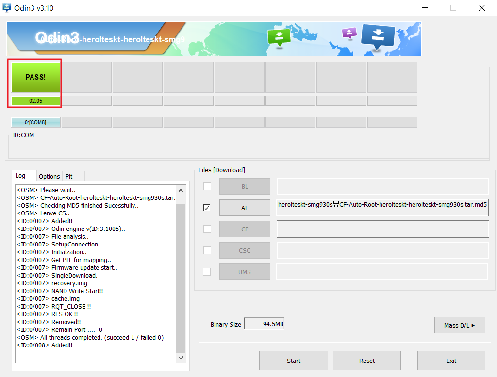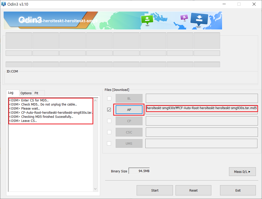 4. Odin 프로그램을 실행하여 AP 버튼을 클릭하고 위에서 압축 해제한 tar.md5 파일을 불러옵니다.