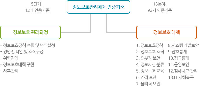| 정보보호관리에 대한 표준적 모델 및 기준을 제시하여 기관 및 기업의 정보보호 관리체계 수립 및 운영을 촉진하고 기업의 정보보호를 위한 일련의 활동 등이 객관적인 인증심사 기준에 적합한 지를 인증기관이 인증하는 제도 |