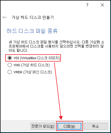 1.5) 하드 디스크의 파일종류를 선택하는 화면입니다. 여기선 VDI를 선택하고 다음을 클릭합니다.