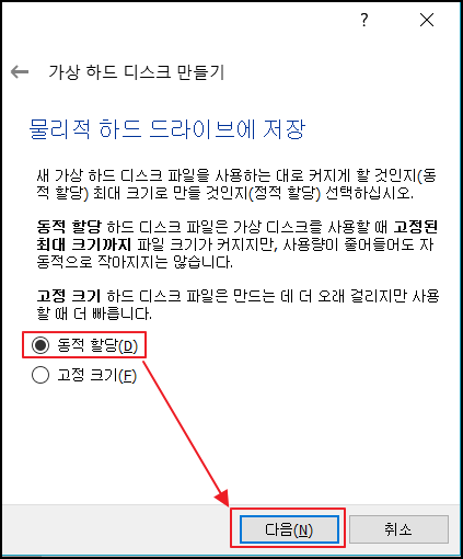 1.6) 하드디스크 파일을 동적으로 할당할건지 고정 크기로 쓸건지 정합니다. 여기선 동적 할당으로 하드디스크 파일을 생성합니다.