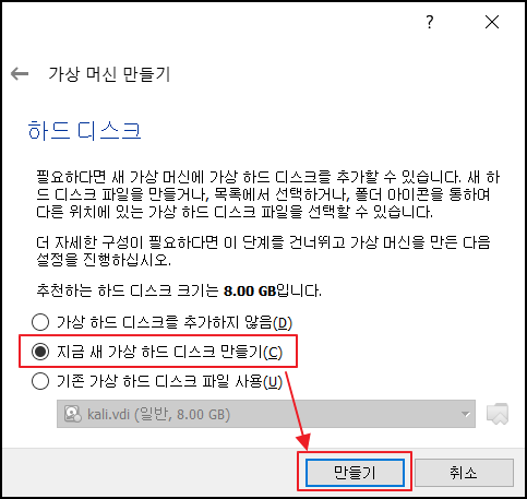 1.4) "지금 새 가상 하드 디스크 만들기"를 선택하고 "만들기" 버튼을 클릭합니다.