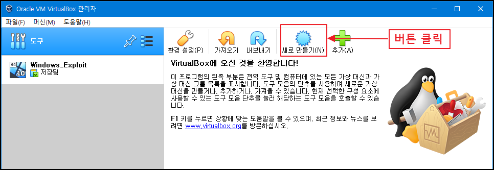 1.1) VirtualBox 메인화면에서 새로 만들기 버튼을 클릭합니다.