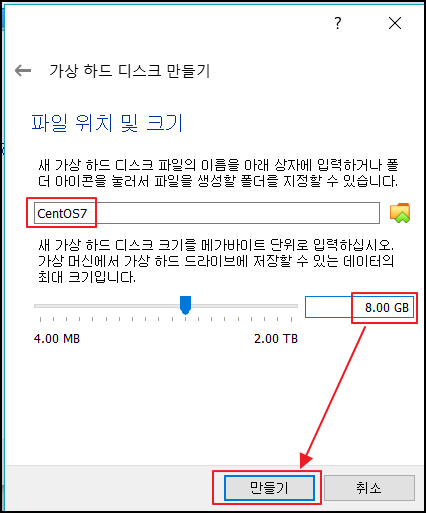 1.7) 하드디스크 파일의 위치를 입력하고 하드 드라이브에 저장할 수 있는 데이터의 최대 크기를 지정하는 화면입니다. 여기선 CentOS7으로 이름을 지정하고, 최대 크기를 8.00GB로 지정합니다.