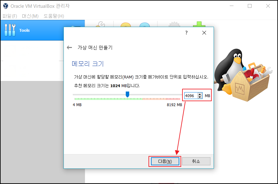 1.3) 가상머신의 메모리를 설정하는 화면입니다. 추천 메모리 크기는 1024MB로 나오지만, 개인적인 경험으론 웹서버나 각종 서비스를 구동하니까 1024MB는 부족한 감이 없지 않아 있더라구요. 그래서 본 글에선 4096MB로 설정합니다.