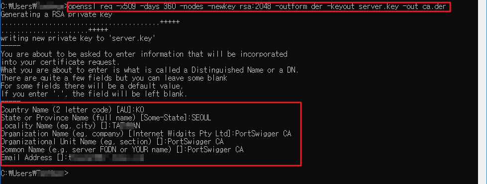 Country Name, State or Province Name 등 아래 빨간색 네모 안의 질의 답변은 아무거나 입력해도 무방합니다.