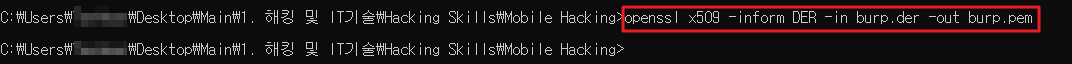 위에서 export한 burp.der 파일을 burp.pem 파일로 변환합니다.