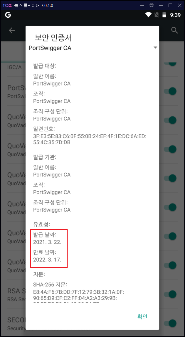 또한, 기본적으로 Burp 인증서는 20년 이상의 만료 기간을 가지는데, 이번 구글 안드로이드 시스템 인증서 같은 경우 최장 39개월 만료 기간으로 설정이 되어 있습니다. 그래서 39개월 기간보단 짧은 인증서를 임의로 생성해야 합니다.