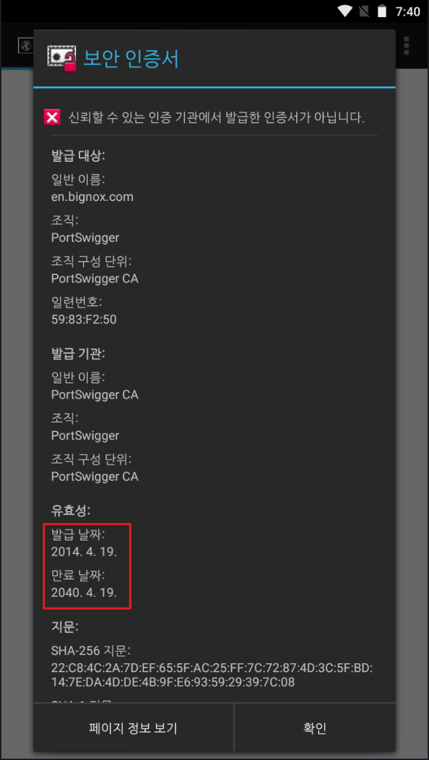 Android 7.0 버전 이상에서는 기존의 Burp 인증서 설치대로 진행하면 아래처럼 오류가 발생합니다. 해당 버전 이상부터는 인증서 저장 위치가 시스템 및 사용자 권한별로 분리되면서 이전처럼 sdcard 디렉터리 아래에 인증서를 설치하면 Burp 사용 시 TLS Connection Failed 에러가 발생하니 시스템 디렉터리에 인증서를 설치해야 합니다.