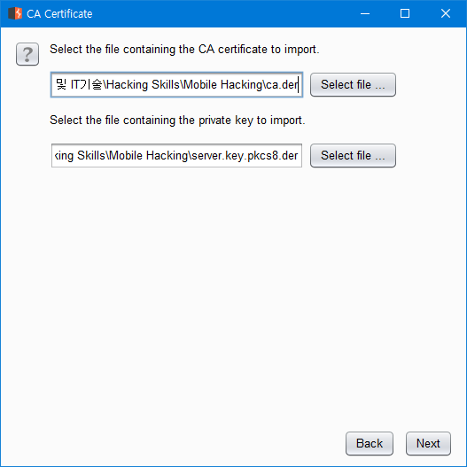 위에서 생성한 ca.der 및 server.key.pkcs8.der 파일을 삽입합니다.