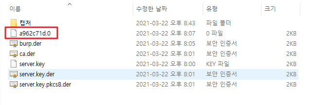 burp.pem의 이름을 위에서 추출한 hash 값(a962c71d)과 확장자 0으로 변경합니다.