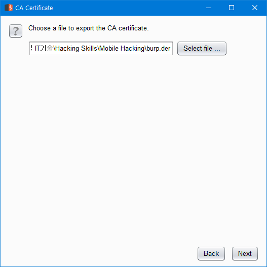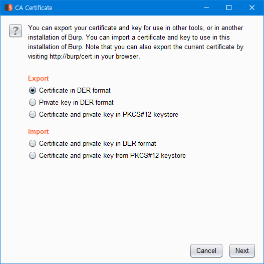 export 할 파일 경로 및 파일명(burp.der)을 지정합니다.